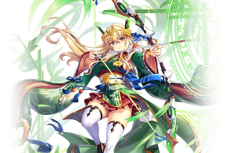 | "Frey is wearing a splendid bamboo-patterned kimono for the New Year. She keeps pursuing the military arts, as usual, even while wielding an unfamiliar bow." | |||