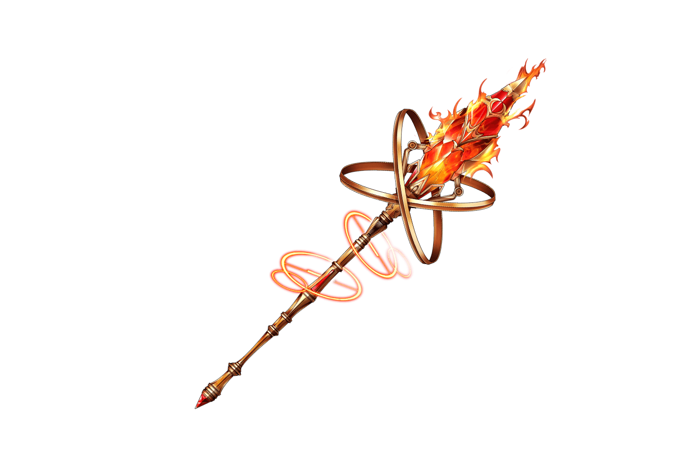 | "A beautiful golden staff with a ruby. It conceals potent fire magic. With a single swing, it returns the enemies to ashes." | |||