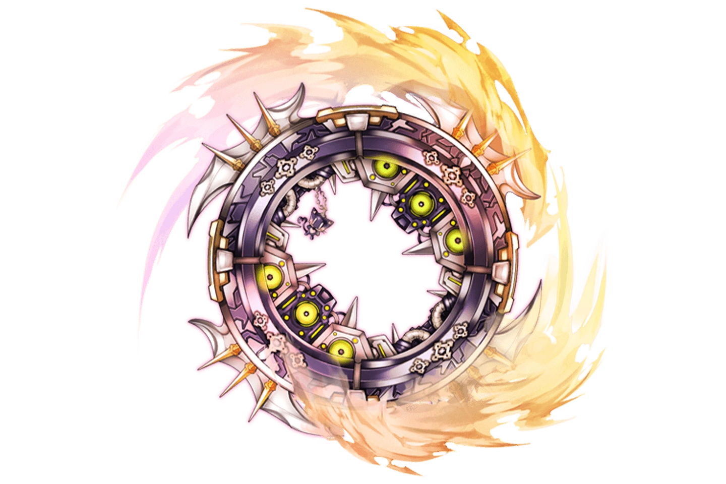 | "Magical disc-shaped weapon that fires light blades all around it. A small person can ride in the center of it like a motorcycle." | |||